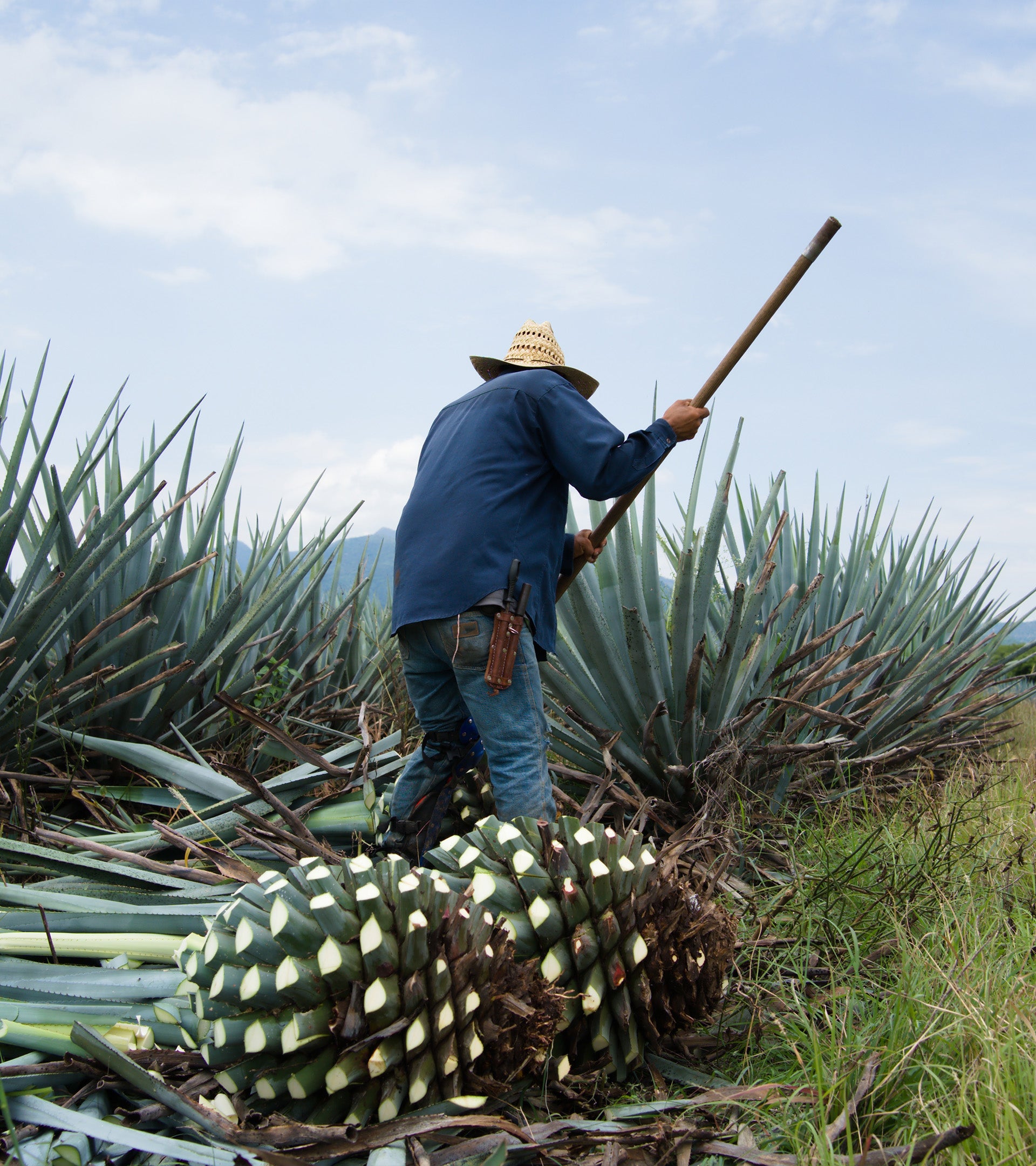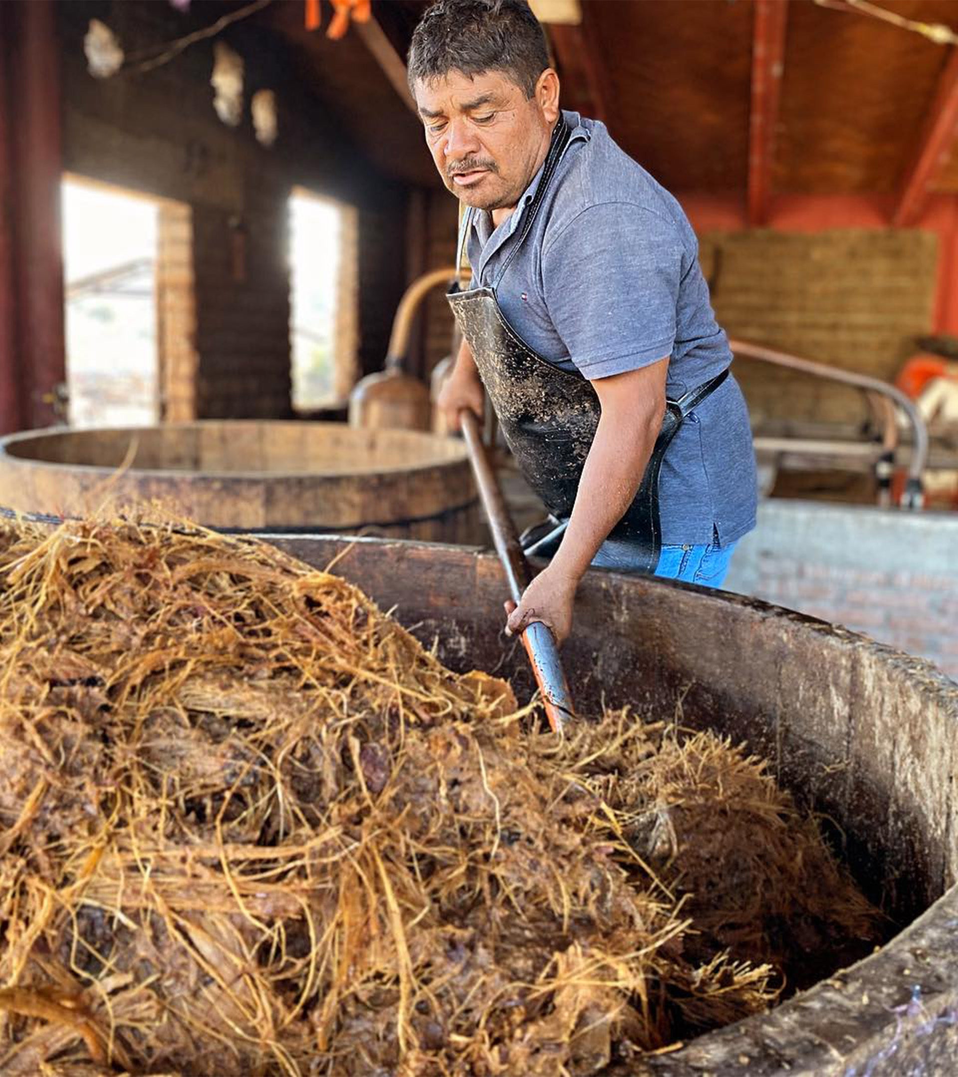 Las piñas cocidas se llevan a una tahona donde son trituradas para separar las fibras del agave.La tahona es jalada por caballos, tratados con cuidado y considerados parte de la familia. La relación cercana con los caballos es un aspecto fundamental para los maestros mezcaleros.