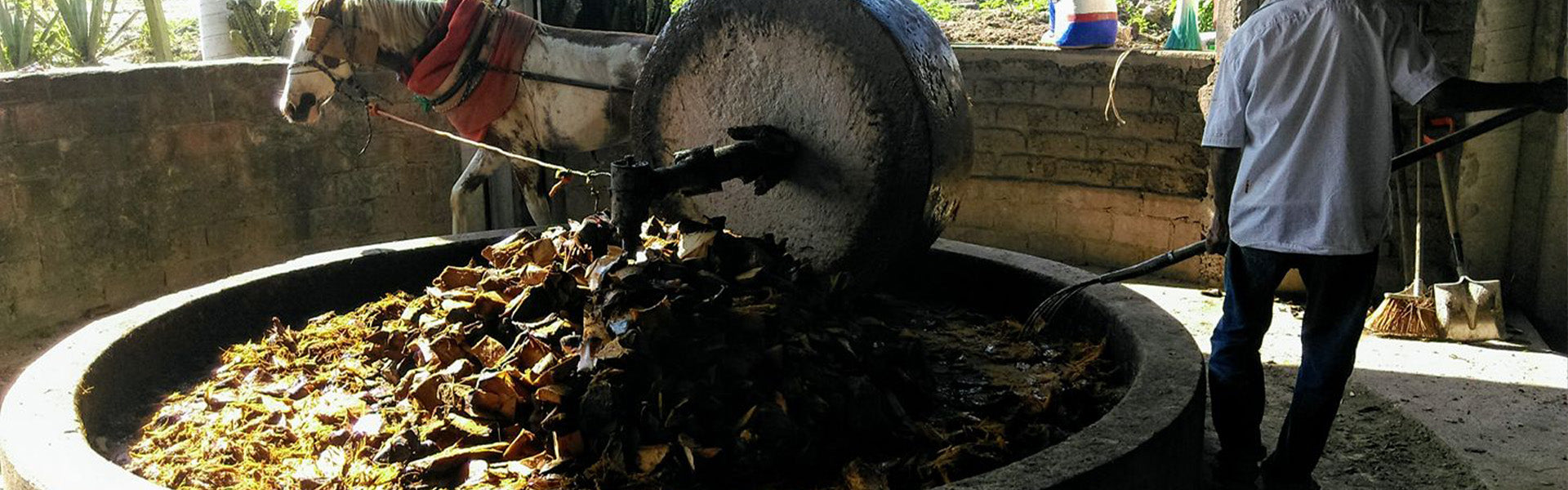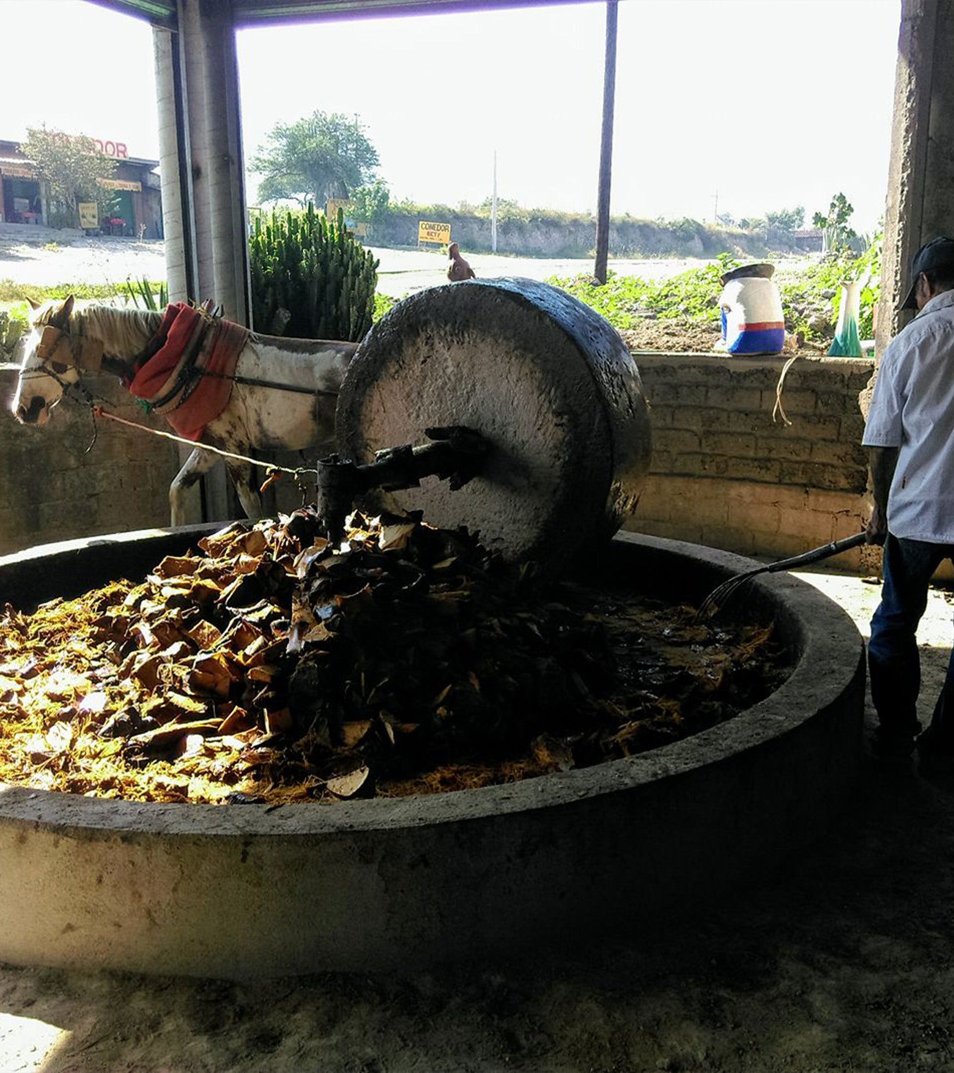 Las piñas cocidas se llevan a una tahona donde son trituradas para separar las fibras del agave.La tahona es jalada por caballos, tratados con cuidado y considerados parte dela familia. La relación cercana con los caballos es un aspecto fundamental para los maestros mezcaleros.